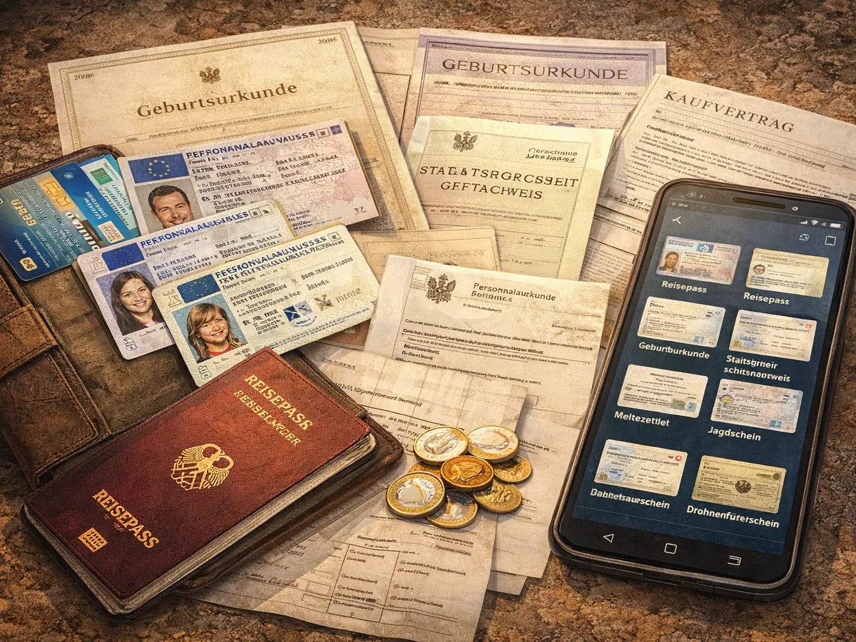 - Wichtige Bescheinigungen wie Jagdschein, Fischerkarte, Amateurfunklizenz, Waffenpass / Waffenbesitzkarte, Schützenpass, Drohnenführerschein, …