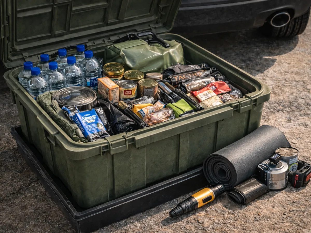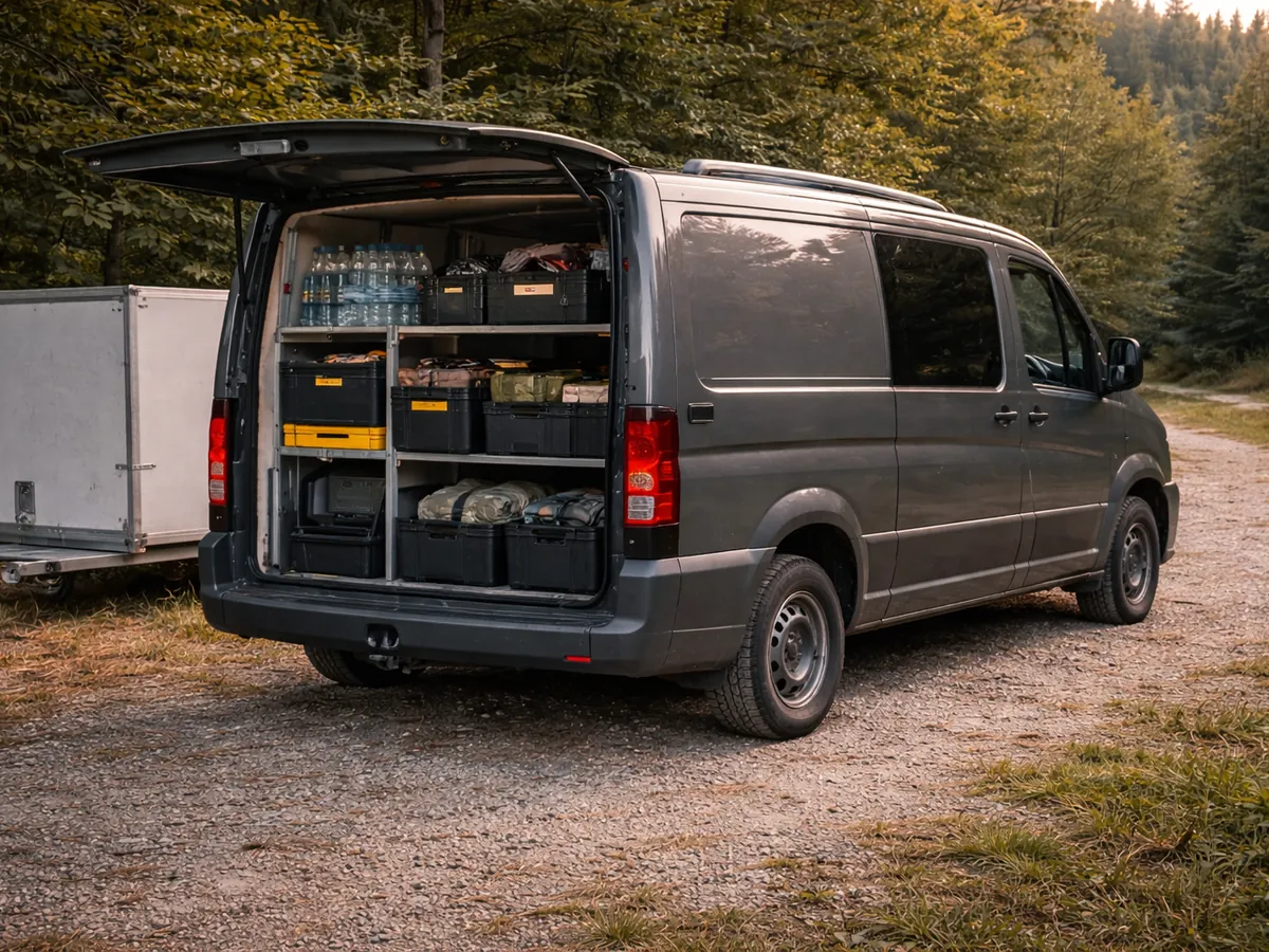 In einem längerfristigen Fluchtszenario benötigst du natürlich auch mehr Vorräte. Deshalb macht es Sinn, dass du einen Teil deiner wichtigsten Vorräte in einer Box in der Nähe des Fahrzeugs griffbereit hältst.