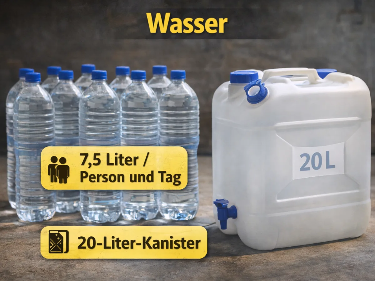 - Wasservorrat für 7 Tage. 52,5 Liter / Person (bspw. 2x 20L Kanister + 9x 1,5L PET-Flasche)